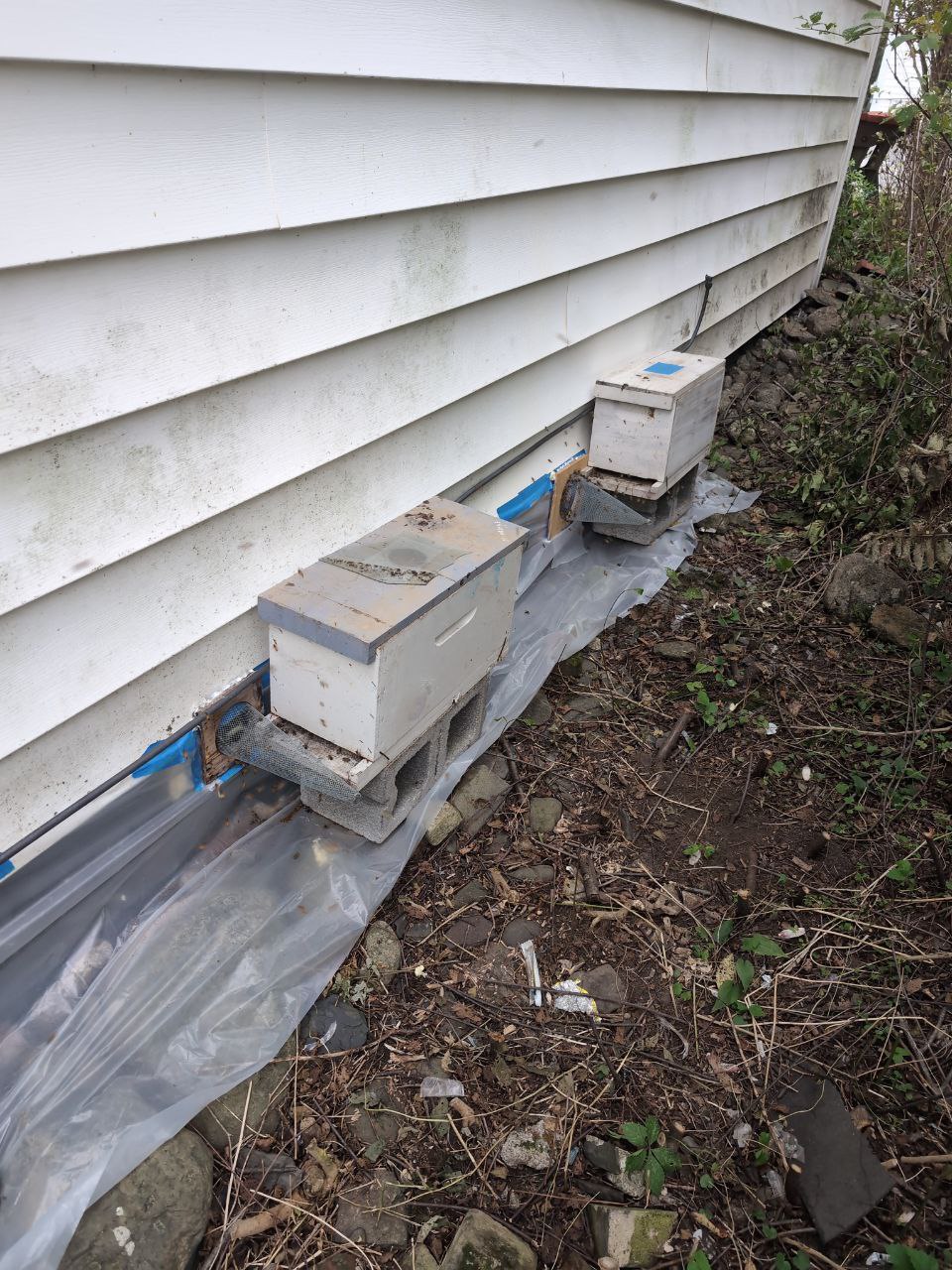 Here’s a double trap-out I’m currently working on at a church hall. There are two colonies in the wall, about six feet apart. This is the second double trap-out I’ve had this year.