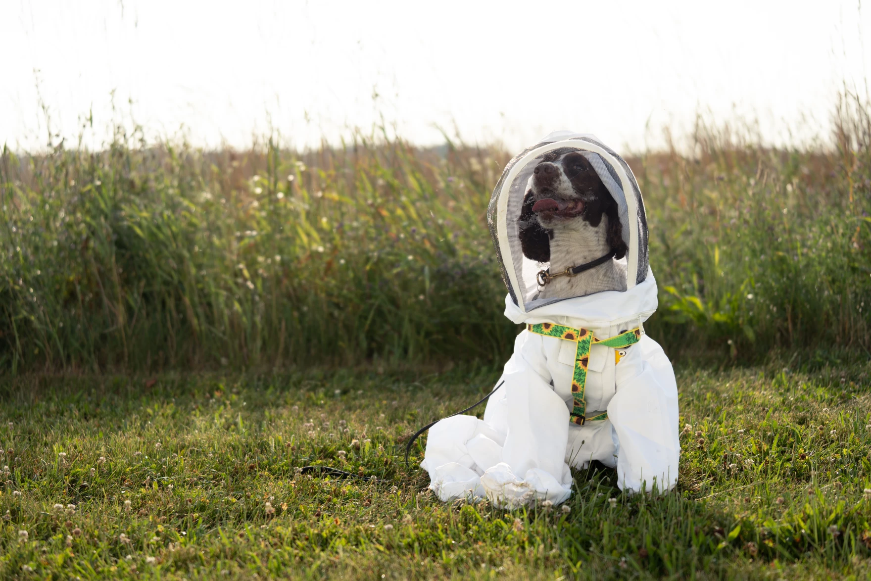 The friendly brown and white dog, with a long tongue that hangs out of her mouth dons her own beekeeping suit and uses her powerful nose to sniff out danger.
